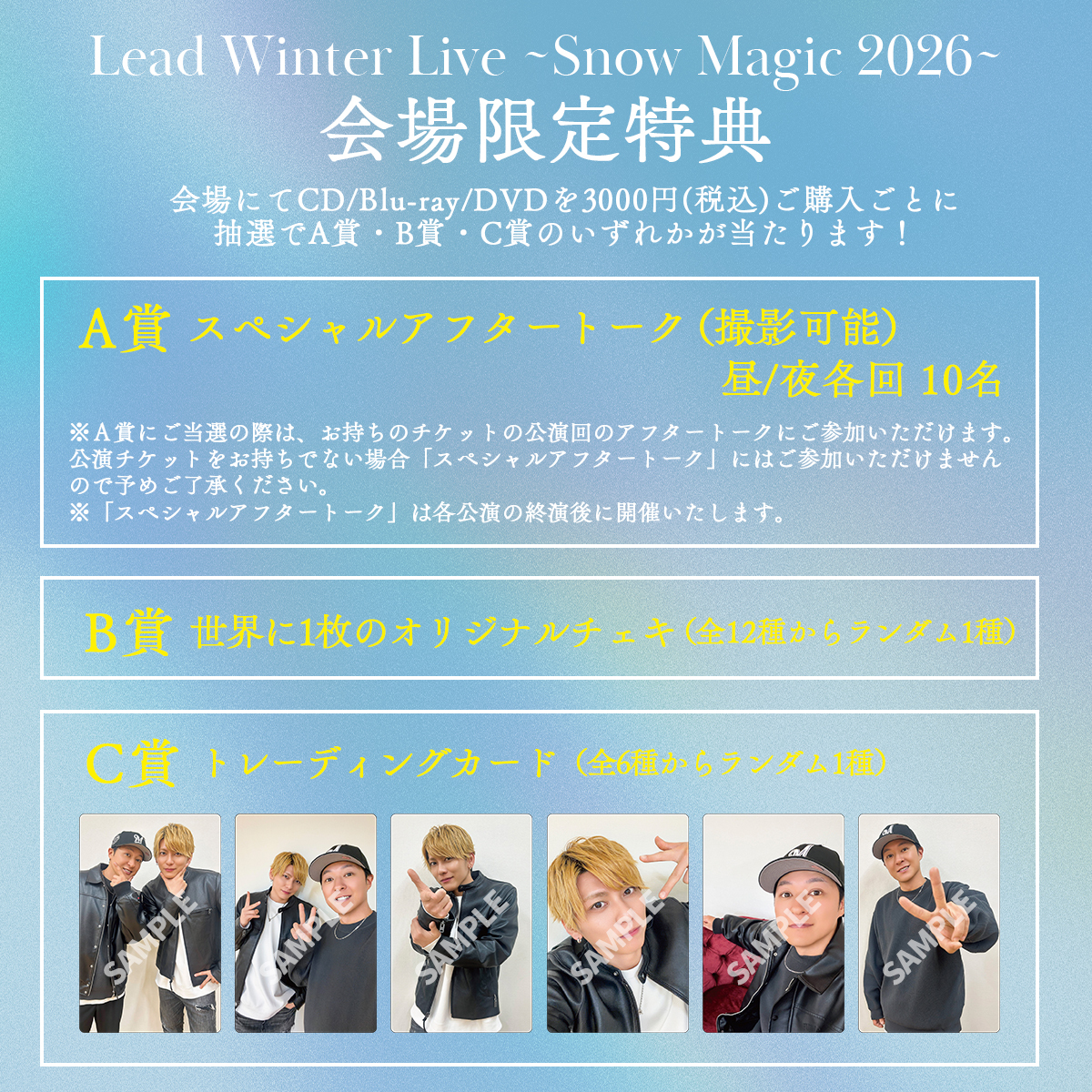「Lead Winter Live 〜Snow Magic 2026〜」会場にてCD/Blu-ray/DVDの販売を実施いたします。会場にて対象商品を3000円(税込)お買い上げごとに1回、スペシャルアフタートークなど豪華賞品が当たる“ハズレなし”の抽選会にご参加いただけます!